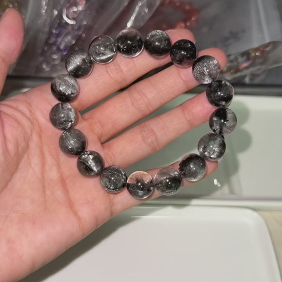 12mm High Quality Rare Natural Genuine Black Brookite Platinum Silver Rutilated Quartz Bracelet healing energy bracelet